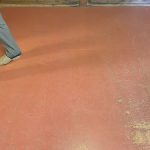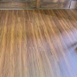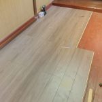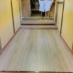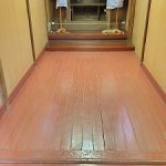 奥の拝殿部分の床は木質のフローリングの上張り工事を行い、入口入ってすぐの床は床の高さと敷居などの納まりの関係もあって、ビニール系のフロアタイル貼りにて仕上げました。